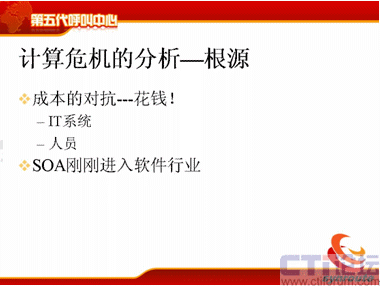 我們分析這個根源,根源其實就是錢的問題,昨天我聽了遠傳的Bill的講座,講得非常精彩,而且非常幽默,他在整個講的過程中,不斷地提一個次,提了30多次,說是“很花錢”呀,“太花錢”了,“很花錢”。確實是很花錢,呼叫中心是一個燒錢的中心,這是他的理論,其實我的想法也是一樣的。那么對于IT系統(tǒng)來說,確實需要花很多錢,現在的系統(tǒng)大家想想系統(tǒng)要么和CRM對接,要么和ERP對接,有的和供應鏈對接,有的和人力資源管理對接,有的和業(yè)務核心系統(tǒng)對接。那么人員上也是很花錢的,對于外包呼叫中心來說,客戶服務200座席左右的,人工的成本占到了75%,這個成本是非常高的,確實是很花錢。那么剛才也說了,剛才那些需求,短信的需求,大家看雖然很復雜,如果給我一千萬的話,我能輕松地把它搞定,給我一年的時間,但這是不現實的。解決的辦法有嗎?有,SOA。SOA是現在軟件行業(yè)一直在做的一件事情,是公認的標準,但是它剛剛進入中國,而且還都沒有進入呼叫中心。