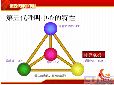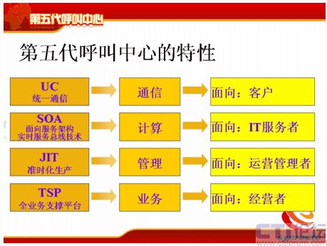 從分代上來講,和何總說的稍微有點差異,但是基本上一樣的,第一代是人工熱線的電話系統(tǒng),時間點也差不多;第二代是有了座席IVR、自動語音應答這個特點;第三代是有了CTI、ACD企業(yè)級的呼叫中心;第四代是互聯網,有VOIP、多媒體等等這些多媒體的呼叫中心。那么第五代是什么?第五代的典型特征是融合共享,它是有四個特性,UC、SOA、JIT和TSP,這是五代的幾個主要特點。