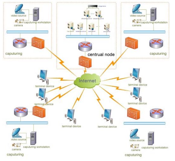 所有的部門的直播系統(tǒng)主要是進行部隊演習、會議等現(xiàn)場的直播,直播信號通過WebLIVE視頻直播采集系統(tǒng)編碼壓縮,通過局域網(wǎng)上傳到中心機房,實時發(fā)布。采集同時,將直播的數(shù)字信號存儲為AVI文件,上傳到放置在視頻點播服務器內,供其它地區(qū)的部隊指戰(zhàn)員進行點播。