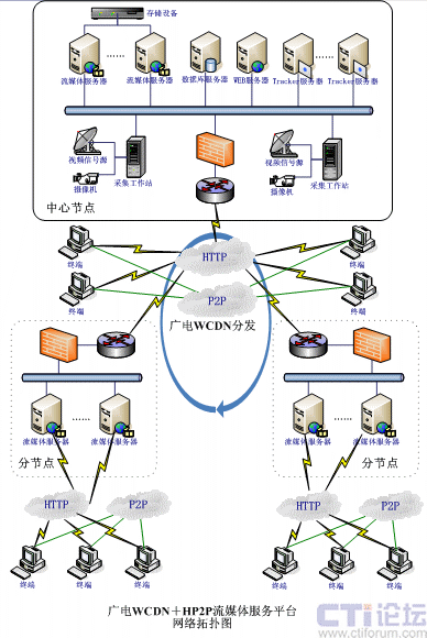 根據(jù)以上情況,廣電系統(tǒng)的流媒體服務(wù)平臺(tái)采用VIEWGOOD流媒體服務(wù)平臺(tái),利用HP2P、WCDN技術(shù)進(jìn)行分級(jí)部署;以下給出網(wǎng)絡(luò)拓?fù)鋱D: