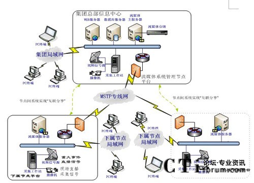 2、集團與各下屬節(jié)點之間采用MSTP專線連接,可實現(xiàn)集團總部視頻資源、網(wǎng)絡(luò)電視直播資源分發(fā)至各分節(jié)點;最終實現(xiàn)集團總部和各下屬單位可以互聯(lián)分享各種實況直播、培訓視頻資源等。
