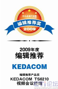 CTI論壇(ctiforum)05月20日消息: 近日,由《中小企業(yè)IT采購(gòu)》舉辦的2009年度編輯推薦獎(jiǎng)評(píng)測(cè)活動(dòng)落下帷幕,科達(dá)TS6210視頻會(huì)議終端以其卓越的視音頻質(zhì)量、優(yōu)異的網(wǎng)絡(luò)適應(yīng)性、極高的性?xún)r(jià)比在本次評(píng)選活動(dòng)中脫穎而出,獲此殊榮。