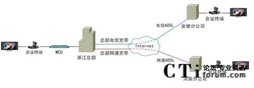 該套視頻會議系統(tǒng)最大的特點就是擁有超強的網(wǎng)絡適應性。由于采用了高效視音頻編碼技術(shù)和大量智能化網(wǎng)絡適應技術(shù),無論是ADSL、光纖還是VPN,均可進行快速接入,并充分保證在Internet環(huán)境下的會議效果。因此,天元置業(yè)此次視頻會議系統(tǒng)就是完全基于公司現(xiàn)有的Internet進行部署的。如圖1。