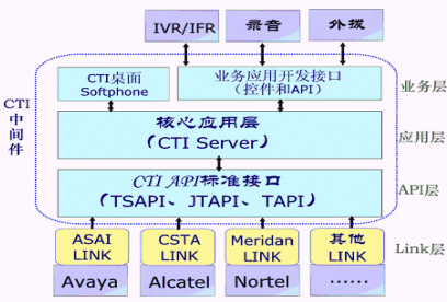 CTI中間件用來(lái)在計(jì)算機(jī)應(yīng)用系統(tǒng)和交換設(shè)備之間充當(dāng)接口作用,起著承上啟下的作用;CT中間件向下提供通用性支持(對(duì)主要交換機(jī)消息接口和符合CSTA標(biāo)準(zhǔn)的交換設(shè)備的支持);向上提供應(yīng)用接口或開(kāi)發(fā)控件,包括呼叫控制、座席管理以及其他設(shè)備接口等功能,這些是CT中間件的核心功能。但目前CTI中間件已經(jīng)拓寬了該應(yīng)用范圍,CTI中間件還向上延伸了功能,提供了一部分業(yè)務(wù)應(yīng)用和業(yè)務(wù)管理功能,如業(yè)務(wù)系統(tǒng)、監(jiān)控系統(tǒng)、計(jì)費(fèi)系統(tǒng)、呼叫統(tǒng)計(jì)報(bào)表的應(yīng)用。