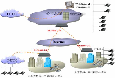 如圖,利用大唐高鴻的VoIP產(chǎn)品MG3000-T4或者MG3000-A/R系列,可以根據(jù)實際遠端用戶數(shù)量選擇相應(yīng)產(chǎn)品,將多個呼叫中心通過IP網(wǎng)絡(luò)匯接,從而實現(xiàn)呼叫中心到各地客戶的低廉話費,節(jié)省呼叫中心整體運營、管理費用。