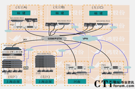 - 上海接入采用電信30B+D線路兩條。使用2E1的MG3000-T4設(shè)備接入。上海南區(qū)IP分機(jī)600門,北區(qū)IP分機(jī)300門,全部采用MG3000-R32(32FXS)設(shè)備做接入。福建龍巖A、B、C,江西高安,河南鄭州這5個(gè)分支分別采用16FXO口網(wǎng)關(guān)與PBX或電信虛擬網(wǎng)直線互聯(lián)。