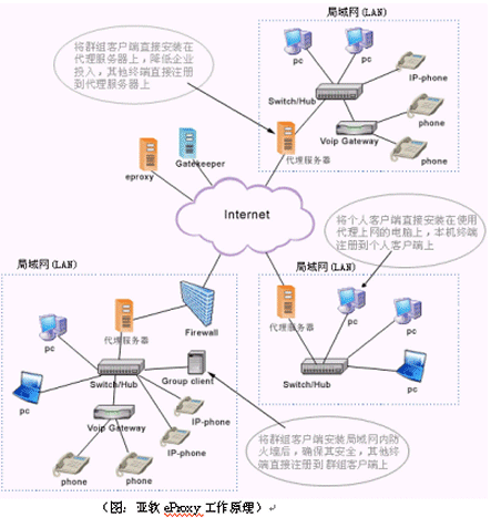 為了解決VoIP通信協(xié)議不能穿越防火墻和NAT的問題,亞軟軟件技術(shù)股份有限公司推出了eProxy代理軟件。它可以在確保網(wǎng)絡(luò)安全、不改變已有設(shè)備和網(wǎng)絡(luò)環(huán)境的情況下,為用戶實現(xiàn)實時的點對點IP語音、視頻和數(shù)據(jù)通信服務(wù)。