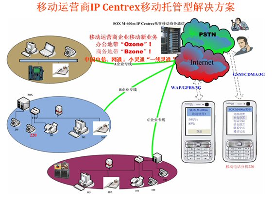 Mail,可發(fā)起WAP電話會(huì)議,可訪問企業(yè)的CRM、ERP等應(yīng)用軟件并集成點(diǎn)擊呼叫等等)。不僅移動(dòng)運(yùn)營商可以替代第一代的移動(dòng)總機(jī),固網(wǎng)運(yùn)營商采用SOX-M移動(dòng)軟交換也可以輕松的開展移動(dòng)總機(jī)(小靈通或手機(jī))的業(yè)務(wù)了,但SOX-M系統(tǒng)融合移動(dòng)運(yùn)營商的無線互聯(lián)網(wǎng)數(shù)據(jù)業(yè)務(wù)將產(chǎn)生更大的利于企業(yè)應(yīng)用的前景,移動(dòng)總機(jī)(語音+WAP)的融合應(yīng)用成為第二代移動(dòng)總機(jī)殺手級應(yīng)用,令移動(dòng)總機(jī)如虎添翼。