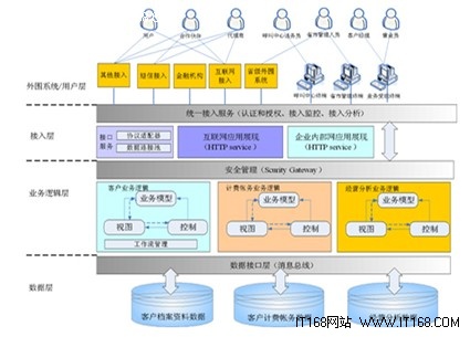 其中,外圍系統(tǒng)/用戶層主要指系統(tǒng)相關(guān)的外圍系統(tǒng),以及業(yè)務(wù)受理、系統(tǒng)管理、綜合查詢、繳費、統(tǒng)計報表、帳務(wù)管理等與客戶或操作人員交互的應(yīng)用系統(tǒng)界面。接入層為最終客戶提供統(tǒng)一的客戶接觸、服務(wù)平臺,為各個營銷渠道服務(wù)人員提供良好的工作平臺,支撐其為客戶提供優(yōu)質(zhì)服務(wù),同時為其它外圍系統(tǒng)和機構(gòu)提供實時、定時批處理接口。業(yè)務(wù)邏輯層(應(yīng)用層)是系統(tǒng)的最核心部分,它接收來自表現(xiàn)層的功能請求,是實現(xiàn)各種業(yè)務(wù)功能的邏輯實體,如業(yè)務(wù)受理中的業(yè)務(wù)新裝、開/停機、業(yè)務(wù)變更以及話費查詢、報表統(tǒng)計計算等。數(shù)據(jù)層用于存放并管理各種系統(tǒng)數(shù)據(jù),如客戶資料數(shù)據(jù)、資源數(shù)據(jù)、銷售數(shù)據(jù)、統(tǒng)計分析數(shù)據(jù)等。
