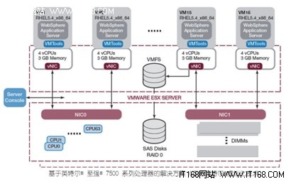 另外,由于電信行業(yè)的特殊性,許多舊的應(yīng)用無法快速有效的部署在新平臺下,造成服務(wù)器利用低,服務(wù)器的數(shù)量越來越多的問題,為此,英特爾與東軟也從幾年前開始進行密切合作,在早期的英特爾至強7300、至強7400、至強7500等一系列四路高端服務(wù)器平臺上搭建了虛擬化解決方案,使過去電信舊的應(yīng)用能夠很快在新平臺上進行部署。下圖顯示的是東軟以兩臺基于英特爾至強 7500 系列處理器的四路服務(wù)器為基礎(chǔ),構(gòu)建了整個 BSS 架構(gòu):
