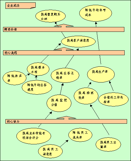 全程全網(wǎng)考核策略目標(biāo)因果關(guān)系圖是"平衡計(jì)分卡"應(yīng)用的重要環(huán)節(jié),在此要特別強(qiáng)調(diào)?因?yàn)樗菍⒏鶕?jù)公司遠(yuǎn)景規(guī)劃以及使命確定的四個(gè)考核維度轉(zhuǎn)化為全程全網(wǎng)考核系統(tǒng)進(jìn)入實(shí)際操作階段之關(guān)鍵步驟。在平衡記分卡的設(shè)計(jì)過(guò)程中,它起著承前啟后的作用,在構(gòu)建呼叫中心全程全網(wǎng)考核系統(tǒng)中全程全網(wǎng)考核策略目標(biāo)因果關(guān)系圖的突破性銜接功能-以其邏輯性的架構(gòu)來(lái)界定和描述實(shí)現(xiàn)全面績(jī)效考核的策略方案。將公司成功、客戶價(jià)值、核心流程和呼叫中心核心能力之間的關(guān)聯(lián)清晰地呈現(xiàn),并將企業(yè)的策略與其績(jī)效衡量系統(tǒng)相銜接。