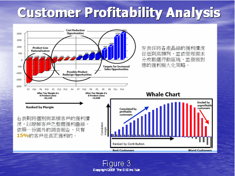 圖3右下角的鯨狀圖進一步地說明了情況:它根據(jù)客戶分配成本,而更清楚地看到客戶收益性。行動成本計算或ABC可以使確保您的業(yè)務(wù)實現(xiàn)贏利的關(guān)鍵成本更清楚易懂。讓我們看一個例子,來比較兩種獲得和保持手機用戶的不同的方法。你將看到該高水平分析法可以很充分地使對呼叫中心利潤的基本要素有更深的理解。