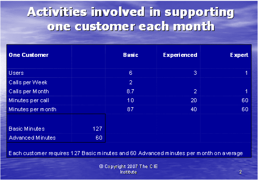圖表1為我們提供了重要的信息,有助于我們計(jì)算一般的客戶在基礎(chǔ)和高級(jí)兩種技術(shù)支持中所需的技術(shù)支持的通話時(shí)長(zhǎng)。我們需要區(qū)分這兩種技術(shù)支持,因?yàn)樘峁└呒?jí)技術(shù)支持的座席的月薪是2000美元,比提供基礎(chǔ)技術(shù)支持,月薪為1000美元的座席每月所花的成本要高。那么,面臨有經(jīng)驗(yàn)的客戶使用者時(shí)該怎么做呢?因?yàn)橹挥袑I(yè)客戶使用者才能要求高級(jí)座席支持,所以他們的需要似乎可以由與初級(jí)客戶使用者打交道的基礎(chǔ)座席處理。