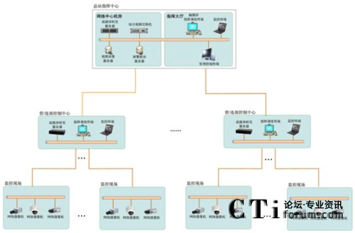 系統(tǒng)采用基于網(wǎng)絡(luò)的分布式控制結(jié)構(gòu),通過通信樓專網(wǎng)連接各機(jī)房和各營等現(xiàn)場監(jiān)控點(diǎn)。分為通信樓一級(jí)指揮調(diào)度平臺(tái),營二級(jí)指揮調(diào)度平臺(tái),結(jié)構(gòu)如下圖。