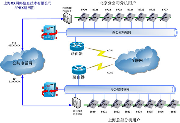 根據(jù)該用戶解決內(nèi)部通訊費(fèi)用的要求,在北京和上海兩個iPBX系統(tǒng)之間實(shí)現(xiàn)互通。兩套iPBX的外線通過普通模擬網(wǎng)關(guān)的FXO口與現(xiàn)存的PSTN線連接。