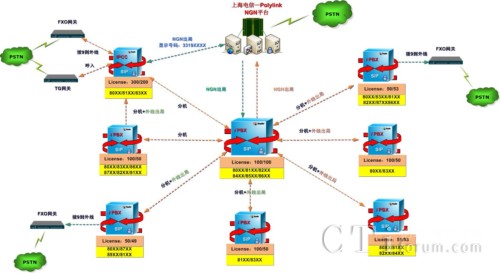 客戶采用IPCC-500型的IPCC系統(tǒng)組建一套分布式呼叫中心系統(tǒng)。它不僅實(shí)現(xiàn)呼叫中心功能,又完全取代傳統(tǒng)PBX作為核心的通信系統(tǒng)。客戶總部容量為300門分機(jī),另有分支機(jī)構(gòu)分別配置一臺IX-100和IX-50,作為分公司的電話交換設(shè)備。外地分部使用IX-50通過互聯(lián)網(wǎng)與總部的IPCC點(diǎn)對點(diǎn)對接,實(shí)現(xiàn)內(nèi)部互通免費(fèi)。客戶的坐席端和用戶端總共約有550門終端。