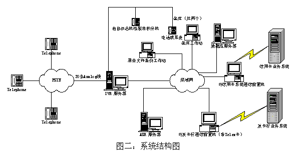 在硬件上系統(tǒng)由語(yǔ)音識(shí)別服務(wù)器、IVR服務(wù)器(含語(yǔ)音卡、坐席卡)、數(shù)據(jù)庫(kù)服務(wù)器、與發(fā)卡行業(yè)務(wù)系統(tǒng)通信前置機(jī)(含Telex卡)、與信用卡網(wǎng)絡(luò)系統(tǒng)通信前置機(jī)、坐席用工作站、錄音文件備份工作站以及相應(yīng)的連接設(shè)備組成。