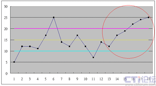 戴明控制圖中的6、9、12法則能夠幫助企業(yè)找到特殊原因,對于這些法則有興趣的讀者,可以到書店研究一下六西格瑪黑帶的培訓書籍,里面還有其它的特殊原因判斷法則,例如1、3、5、15法則,也就是: