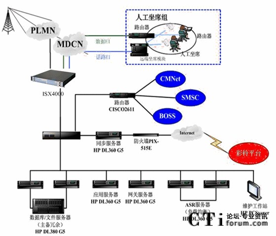 平臺核心話路接入集在中毅航通信iSX4000智能業(yè)務(wù)交換機的IVR自動語音平臺,人工坐席平臺通過和系統(tǒng)支撐軟件實現(xiàn)遠端坐席功能,通過專線中繼與IVR平臺實現(xiàn)話路連接;InterNet與IVR平臺實現(xiàn)數(shù)據(jù)同步。根據(jù)移動交換網(wǎng)傳輸內(nèi)容選擇應(yīng)相的IVR自動語音服務(wù)或人工坐席服務(wù)。
