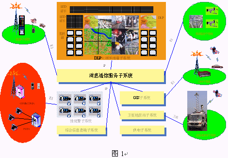 消息隊列服務器采用國際領先的計算機支持的協(xié)同技術進行設計開發(fā),實現(xiàn)三臺合一指揮調(diào)度系統(tǒng)眾多子系統(tǒng)間的無縫集成,包括數(shù)據(jù)流(包括信令)的集成、工作流的集成、應用的集成、信息的集成、語音鏈路的集成。它是好易通科技三臺合一指揮調(diào)度系統(tǒng)所有子系統(tǒng)之間進行TCP/IP消息傳遞的中轉(zhuǎn)站,負責消息的分發(fā)和系統(tǒng)協(xié)同功能。它提供了接處警座席子系統(tǒng)、GIS警用地理信息子系統(tǒng)、集群通信系統(tǒng)、GPS衛(wèi)星定位子系統(tǒng)、視頻監(jiān)控子系統(tǒng)、大屏幕顯示子系統(tǒng)、應急通信車子系統(tǒng)、綜合信息查詢子系統(tǒng)之間相互數(shù)據(jù)通信的接口,如圖1所示。