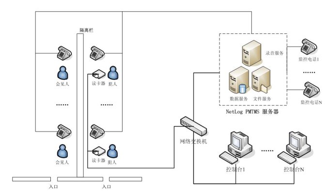 NetLog PMTMS會(huì)客室電話(huà)管理系統(tǒng)采用基于分布式、多層控制管理體系的設(shè)計(jì)思想,將電話(huà)線(xiàn)路與內(nèi)部網(wǎng)絡(luò)有效地結(jié)合在一起,形成一套完整管理系統(tǒng),包括會(huì)見(jiàn)監(jiān)控、通話(huà)錄音、數(shù)據(jù)管理。