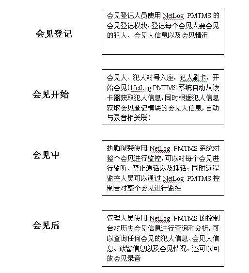 通過(guò)NetLog PMTMS系統(tǒng)的改善,整個(gè)會(huì)見(jiàn)流程變的高效和先進(jìn)。改善后的會(huì)見(jiàn)流程如下: