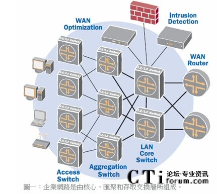 復(fù)雜的網(wǎng)絡(luò)拓?fù)?/b>:網(wǎng)絡(luò)架構(gòu)因內(nèi)含龐雜的多層網(wǎng)絡(luò),而變得越來越復(fù)雜。目前多數(shù)企業(yè)網(wǎng)絡(luò)都是三層式拓?fù),包括?shù)據(jù)匯聚層或分發(fā)層。許多網(wǎng)絡(luò)都已部署了匯聚交換機(jī),以彌補(bǔ)傳統(tǒng)存取及核心交換機(jī)欠缺高速光纖接口的缺陷,以便支持直接的連接。有些企業(yè)甚至建立了第四層網(wǎng)絡(luò),由連接到核心交換機(jī)的核心路由器組成。這樣的網(wǎng)絡(luò)架構(gòu)雖然可以發(fā)揮一定的作用,但卻大幅增加了資本支出,造成操作流程過于復(fù)雜,并為管理帶來沉重負(fù)擔(dān)。此外,這類架構(gòu)也會增加網(wǎng)絡(luò)的等待時間,并導(dǎo)致超額負(fù)載的情況出現(xiàn),因而降低了應(yīng)用效能。