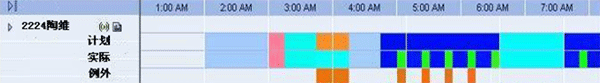 如圖,通過與PBX、CTI系統(tǒng)的接口,排班系統(tǒng)獲取座席的實時狀態(tài)信息,如登錄、接聽、話后處理、登出等,并以不同的顏色進(jìn)行表示,與計劃的班次安排進(jìn)行比對,從而監(jiān)控到座席的遵時例外(非遵時)。通過這種方式,座席的實時狀態(tài)變化能夠及時的得到監(jiān)控,便于管理人員精確的監(jiān)控遵時,同時,也把班長從遵時管理中部分解脫出來。