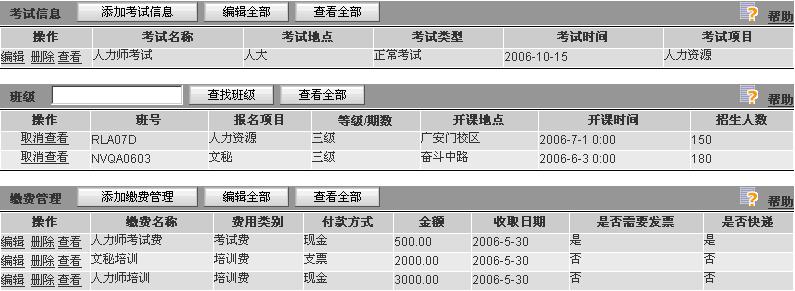 點(diǎn)擊單個(gè)學(xué)員查看頁面的相關(guān)列表,直接添加其他考務(wù)信息。張小玲是報(bào)名人力資源三級(jí)和文秘三級(jí)的學(xué)員,人力三級(jí)學(xué)習(xí)需要代辦考試。繳納人力培訓(xùn)費(fèi)3000元,文秘培訓(xùn)2000元,報(bào)名人力資源管理師考試費(fèi)500元。