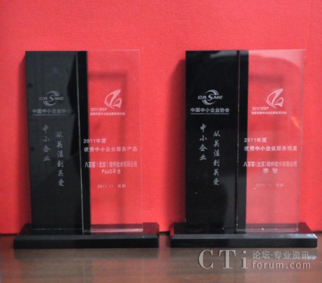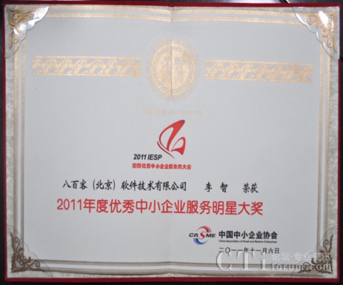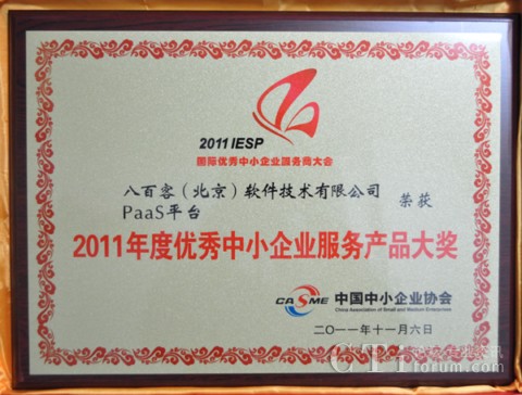 作為國內(nèi)首家SaaS廠商,八百客積極推動云計算在中小企業(yè)中的宣傳與運用。2006年,八百客在國內(nèi)率先推出管理自動化開發(fā)平臺800APP, 它擴展了按需服務,并實現(xiàn)了客戶可根據(jù)需要自定制應用程序,成為了改變應用程序開發(fā)的一個新途徑。為表彰八百客在中小企業(yè)信息化中做出的杰出貢獻,本次大會特別為八百客頒發(fā)了“2011年度優(yōu)秀中小企業(yè)服務產(chǎn)品大獎”,此外還授予八百客總經(jīng)理李智 “2011年度優(yōu)秀中小企業(yè)服務明星大獎”。