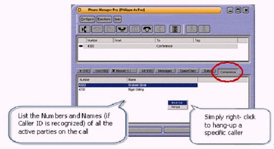 Office Phone Manager, 會(huì)議的發(fā)起者可以控制:每個(gè)與會(huì)者主被叫號(hào)碼(如果有姓名識(shí)別則會(huì)顯示姓名)會(huì)在Conference