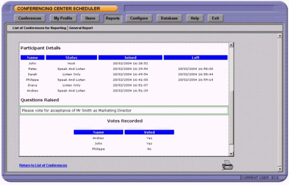 管理員可以生成會(huì)議使用率和每個(gè)會(huì)議的報(bào)告。消息內(nèi)容包括會(huì)議名稱(chēng),ID號(hào),會(huì)議起始日期,會(huì)議持續(xù)時(shí)間和與會(huì)人員的數(shù)目。每個(gè)會(huì)議報(bào)告可以列出與會(huì)人員的詳細(xì)列表和他們何時(shí)進(jìn)入/離開(kāi)會(huì)議。