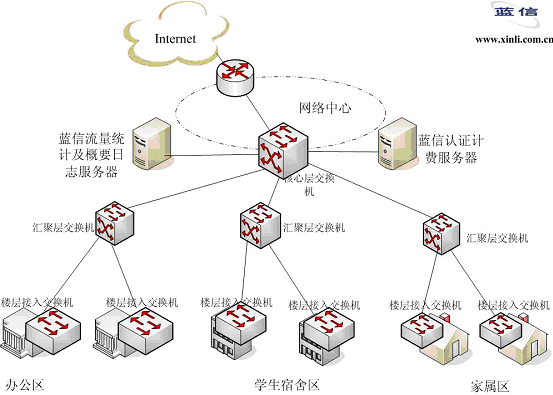 在網(wǎng)絡(luò)中心機(jī)房部署“藍(lán)信認(rèn)證計(jì)費(fèi)系統(tǒng)”,藍(lán)信認(rèn)證計(jì)費(fèi)系統(tǒng)除支持標(biāo)準(zhǔn)的RADIUS協(xié)議外,還支持領(lǐng)先的802.1x協(xié)議,通過與各接入層交換機(jī)的配合,實(shí)現(xiàn)了認(rèn)證管理功能。通過綁定帳號(hào)、IP、MAC地址等15元素,真正保證只有合法用戶才能通過認(rèn)證;對(duì)用戶進(jìn)行分級(jí)權(quán)限管理,可按信用度等級(jí)對(duì)用戶進(jìn)行劃分,方便了用戶的管理。此外,在網(wǎng)絡(luò)出口處部署藍(lán)信流量統(tǒng)計(jì)工具,通過與藍(lán)信認(rèn)證計(jì)費(fèi)系統(tǒng)的配合,實(shí)現(xiàn)對(duì)用戶按流量來計(jì)費(fèi),可以把用戶訪問流量按校內(nèi)校外、國(guó)內(nèi)國(guó)際來區(qū)別對(duì)待,并設(shè)置不同的費(fèi)率。同時(shí),還部署了藍(lán)信概要日志系統(tǒng),有效記錄了用戶的上網(wǎng)信息,并提供人性化的web客戶端,方便管理者進(jìn)行事后查詢,有效的控制了網(wǎng)絡(luò)的安全性。