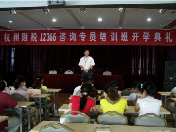圖為杭州財(cái)稅12366咨詢專員培訓(xùn)班開(kāi)學(xué)典禮上杭州財(cái)稅局人事處領(lǐng)導(dǎo)講話