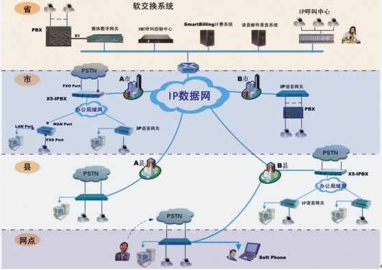 在各級辦公機構(gòu)根據(jù)原有用戶數(shù)量,可以配置IP電話綜合接入設(shè)備或IP-PBX,連接當(dāng)?shù)卦械霓k公電話環(huán)境(程控電話交換機、直線市話、電信虛擬網(wǎng)等)。實現(xiàn)機構(gòu)內(nèi)部辦公電話/傳真通過IP數(shù)據(jù)網(wǎng)通信。同時機構(gòu)以外的長途電話/傳真也可以利用IP電話網(wǎng)傳輸,而不產(chǎn)生任何長途通信費用。