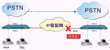 IP數(shù)據(jù)網(wǎng)故障或設(shè)備斷電時,呼叫可自動跳轉(zhuǎn)到PSTN市話網(wǎng),同時播放語音告警。