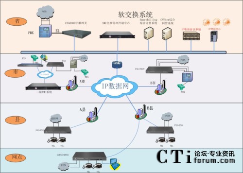 IP電話系統(tǒng)項(xiàng)目方案設(shè)計(jì)共分省、地州市、縣(市)三級進(jìn)行部署,按照省集團(tuán)至地州市分集團(tuán)、縣(市)級分集團(tuán)及營業(yè)廳建設(shè),全網(wǎng)通過部署相應(yīng)的IP電話設(shè)備(含語音軟交換、接入網(wǎng)關(guān)、PC軟電話、網(wǎng)管軟件、計(jì)費(fèi)軟件等),組建全省IP電話系統(tǒng)。