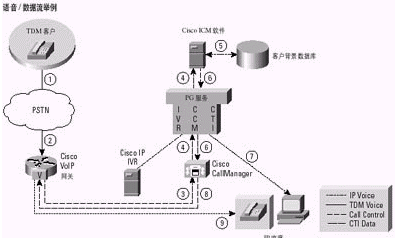 注意2:這一樣本語音/數(shù)據(jù)流描述了一個(gè)單地點(diǎn)IPCC實(shí)現(xiàn)。另外,可以將IPCC集成到一個(gè)多地點(diǎn)聯(lián)絡(luò)中心,并獲得ICM軟件所提供的可貫穿整個(gè)企業(yè)的、網(wǎng)絡(luò)級的路由預(yù)選功能所能帶來的好處。