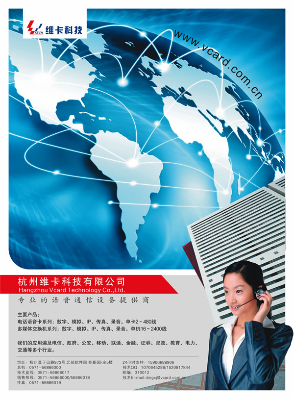 維卡科技有限公司(簡稱“維卡科技”)成立于2004年,是一家以下一代網(wǎng)絡(luò)通信為發(fā)展方向的高科技企業(yè),公司成立于上海,在杭州設(shè)立研發(fā)和生產(chǎn)基地,公司主要從事通信和語音產(chǎn)品的研究、開發(fā)、生產(chǎn)及銷售,是國內(nèi)通信語音產(chǎn)品―――電話語音卡的核心供應(yīng)商之一。公司匯集一批多年從事CTI技術(shù)研究的高級專業(yè)人才,堅持自主創(chuàng)新,自主研發(fā),不斷推出適合人性化的一流產(chǎn)品,經(jīng)過短短幾年的發(fā)展,公司的語音卡產(chǎn)品已經(jīng)躋身全國三強(qiáng),為中國的CTI行業(yè)貢獻(xiàn)了一份力量。
