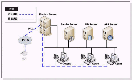 Samba Dialer®通過China ISDN PRI直接和PSTN連接,系統(tǒng)結(jié)構(gòu)如下圖所示: