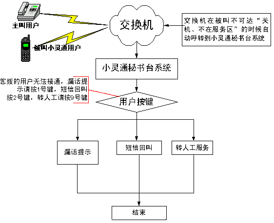 當(dāng)主叫用戶撥打被叫小靈通用戶,而被叫小靈通用戶處于不可達(dá)(關(guān)機(jī)、忙、不在服務(wù)區(qū))狀態(tài)時(shí),該呼叫自動轉(zhuǎn)入轉(zhuǎn)到小靈通秘書臺系統(tǒng)后,用戶選擇短信回叫,系統(tǒng)在被叫小靈通用戶空閑后,會發(fā)送短信通知主叫用戶,被叫已經(jīng)恢復(fù)狀態(tài),可以呼叫。