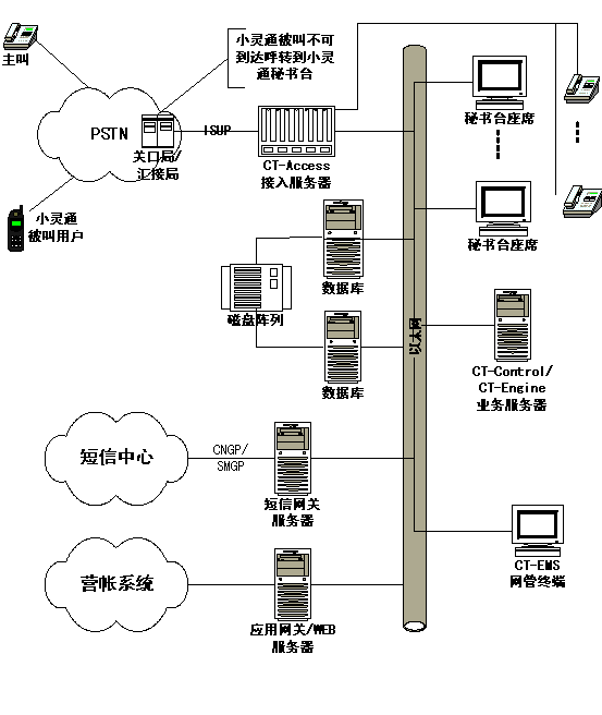 如上圖所示,小靈通秘書臺網(wǎng)絡(luò)拓?fù)鋱D,上圖中紅色虛線的左邊為運(yùn)營商部分,紅線是接口部分, 紅色虛線的右邊是增加的小靈通秘書臺設(shè)備和工程實(shí)施部分。首先需要在小靈通網(wǎng)絡(luò)的關(guān)口局或者匯接局設(shè)置被叫不可到達(dá)(關(guān)機(jī)、忙、不在服務(wù)區(qū))呼叫前轉(zhuǎn),通過ISUP協(xié)議呼叫到小靈通秘書臺的CT-Access接入服務(wù)器,提取主叫號碼、被叫號碼、原被叫號碼,同時(shí)給主叫播放語音,"您撥的用戶無法接通,您可以選擇失話復(fù)得業(yè)務(wù),本業(yè)務(wù)每條短信收費(fèi)0.1元,漏話提示請按1號鍵,短信回叫請按2號鍵,轉(zhuǎn)人工請按9號鍵"。然后根據(jù)主叫的響應(yīng)選擇提供服務(wù)(業(yè)務(wù)流程見第3章)。小靈通秘書臺的業(yè)務(wù)部分由CT-Control/CT-Engine業(yè)務(wù)服務(wù)器和數(shù)據(jù)庫服務(wù)器組成,另外包括人工臺和短信網(wǎng)關(guān),短信網(wǎng)關(guān)通過CNGP(網(wǎng)通)、SMGP(電信)和短信中心網(wǎng)關(guān)接口,實(shí)現(xiàn)短信發(fā)送功能。業(yè)務(wù)網(wǎng)關(guān)和WEB服務(wù)器為可選部分,根據(jù)業(yè)務(wù)需要選配。