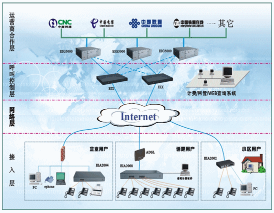 - 在運(yùn)營(yíng)商合作層,EIG5000系列是集軟交換為一體的數(shù)字中繼網(wǎng)關(guān),與傳統(tǒng)運(yùn)營(yíng)方案比減少了設(shè)備投入,更加保證可靠方便的應(yīng)用,EIG5000系列可以配合網(wǎng)管系統(tǒng)、計(jì)費(fèi)系統(tǒng)、WEB管理系統(tǒng)組成整個(gè)完整的局端運(yùn)營(yíng)系統(tǒng),而增加EIX7100設(shè)備可以更好的冗余備份,使整個(gè)運(yùn)營(yíng)平臺(tái)更加穩(wěn)定。EIA設(shè)備根據(jù)客戶類型和需求配置相應(yīng)的設(shè)備;