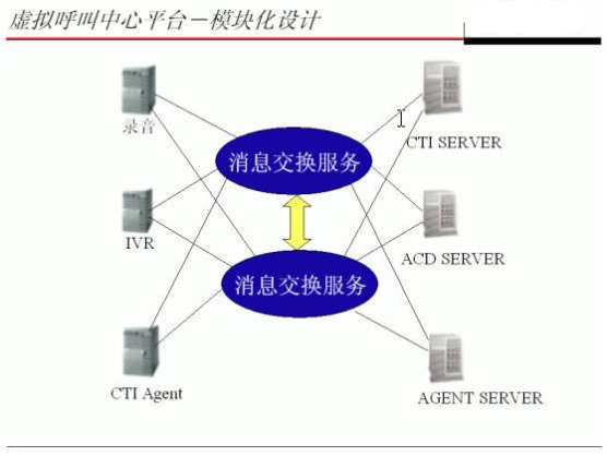 而呼叫中心平臺(tái),則由網(wǎng)絡(luò)模塊方式組成:CTI服務(wù)器、ACD服務(wù)器、AGENT服務(wù)器、IVR服務(wù)器、錄音服務(wù)器等,這些呼叫中心平臺(tái)模塊,采用消息交換服務(wù)器的心型連接,組成統(tǒng)一的系統(tǒng),從而充分保證系統(tǒng)的靈活性、擴(kuò)充性。