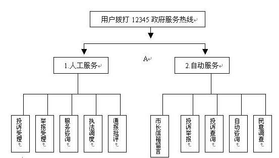當(dāng)用戶撥通"12345"電話并選擇自動(dòng)服務(wù)時(shí),聲訊臺(tái)自動(dòng)播放引導(dǎo)語"選擇市長(zhǎng)信箱留言請(qǐng)按1,自動(dòng)投訴舉報(bào)請(qǐng)按2,投訴查詢請(qǐng)按3,服務(wù)咨詢請(qǐng)按4,民意調(diào)查請(qǐng)按5。