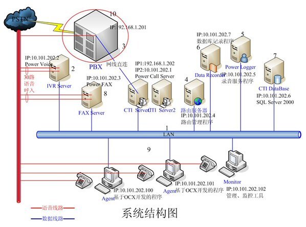 - IVR Server和FAX Server采用高品質(zhì)的工控機(jī),配置和軟件環(huán)境基本一樣。每臺(tái)機(jī)器均有30路語(yǔ)音接入,分別裝有一套Power