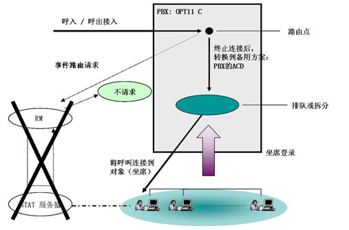 - 當(dāng)RM出現(xiàn)故障(包括Server物理?yè)p壞、RM程序意外終止、網(wǎng)絡(luò)連接失效)時(shí),RM將對(duì)電話的控制權(quán)交還給PBX,PBX根據(jù)自己的電話分配規(guī)則將電話分配到坐席。