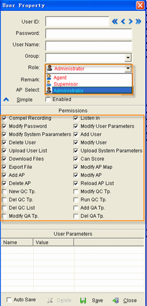 此用戶隸屬于管理員級(jí)別,但只能管理本組用戶,對(duì)于渣打銀行來(lái)說(shuō):只能查看所在支行(或者分行)的錄音歷史紀(jì)錄;查看所在支行(或者分行)的AP服務(wù)器狀態(tài);更新所在支行(或者分行)的AP服務(wù)器的系統(tǒng)參數(shù);立即同步所在支行(或者分行)的錄音歷史紀(jì)錄。