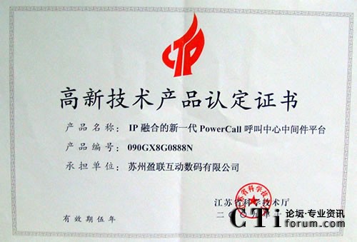 CTI論壇(ctiforum)4月20日消息(記者 楊毅):近日,蘇州盈聯(lián)互動(dòng)數(shù)碼有限公司榮獲江蘇省科學(xué)技術(shù)廳頒發(fā)的高新技術(shù)產(chǎn)品認(rèn)定證書(shū),這標(biāo)志著盈聯(lián)作為一家專(zhuān)業(yè)的呼叫中心解決方案提供商,其產(chǎn)品的先進(jìn)性和高品質(zhì)已獲得了中國(guó)技術(shù)部門(mén)的官方認(rèn)可。