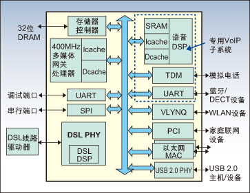 圖2演示了這種架構(gòu)的一個(gè)例子,即一款帶集成ADSL和VDSL2寬帶連接功能的SoC。該SoC具有一個(gè)工作在400MHz頻率的多媒體網(wǎng)關(guān)處理器,性能比以前產(chǎn)品提升了一倍。附加的硬件加速器和32位寬的存儲(chǔ)器接口進(jìn)一步提升了該網(wǎng)關(guān)的聯(lián)網(wǎng)能力。